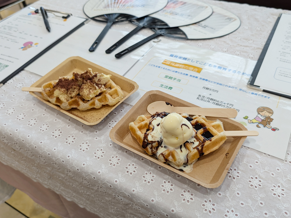 2025.08.08 2025年 8月31日 (日) エコール・リラ(藤原台) 養育里親相談会 10:00-17:00 場所: エコール・リラ(藤原台) 南館5階サイゼリア前 たくさんのご来場ありがとうございました。 黄色いポスターが目印です ご来場いただいた皆さまへ、冷たいアイスワッフルをお楽しみいただきました